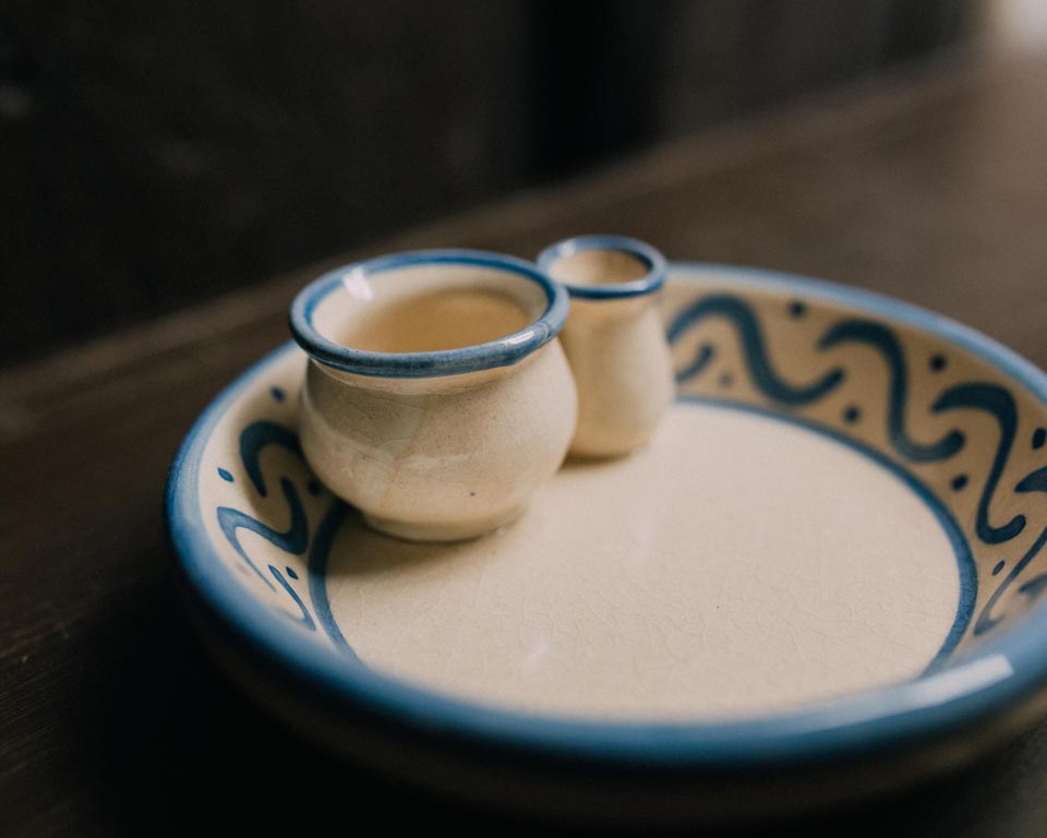 Aceitunero de cerámica tradicional. Empleado para servir aperitivos con espacio para huesos y palillos.